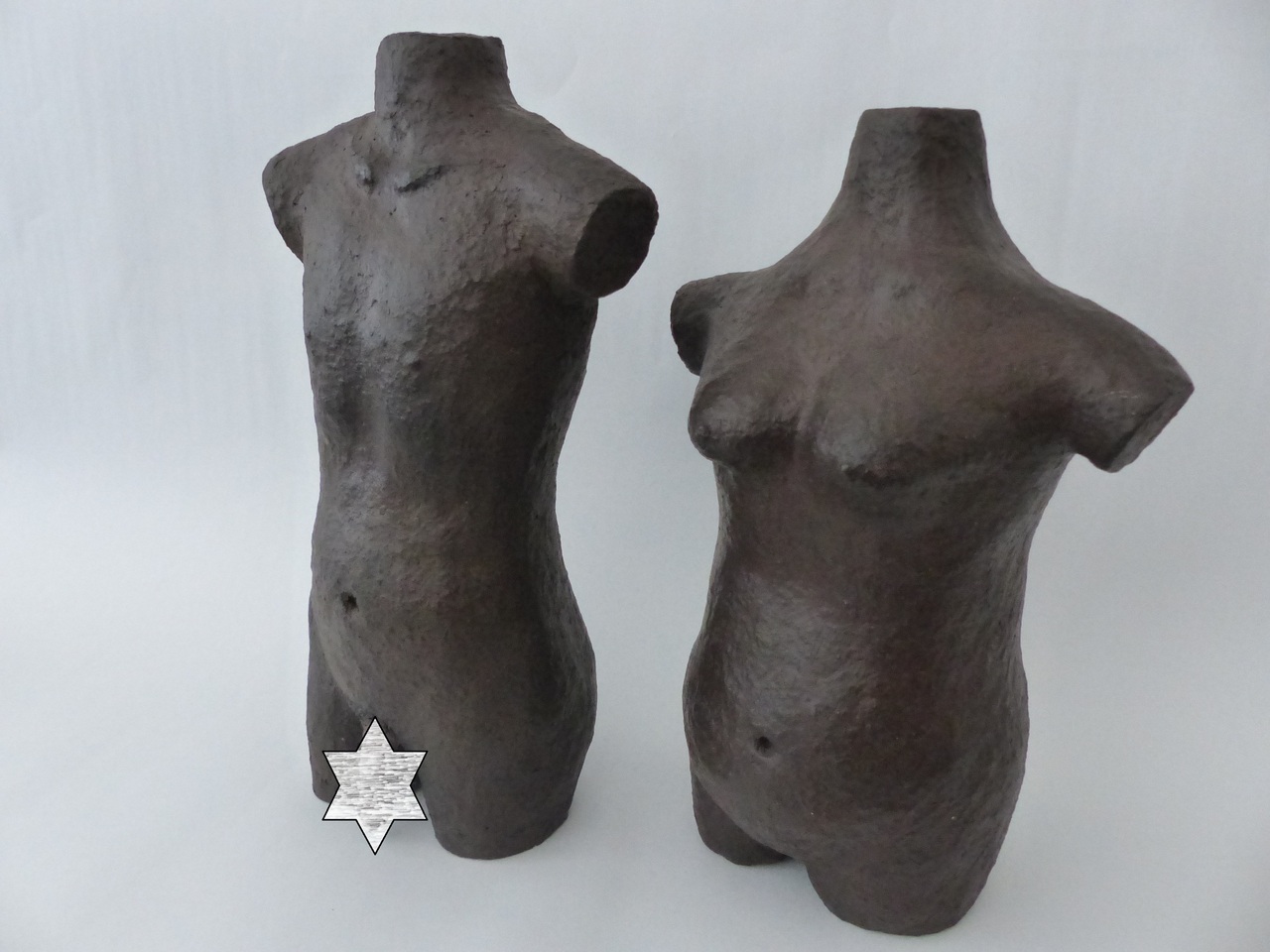 Torso van man en vrouw. Enige overeenkomst met de werkelijkheid berust op louter toeval. Volledige openheid op aanvraag. Ongeglazuurde keramiek.