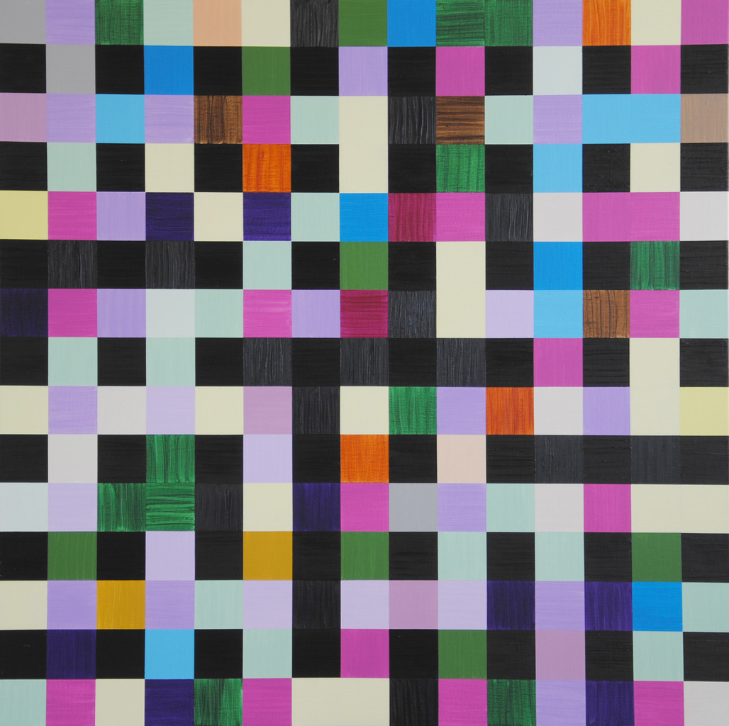 Thema: Chaos (Geometrische Chaos) Mijn kunst is beïnvloedt door de moderne wiskundige en wetenschappelijke benadering van het begrip complexe orde van de natuur. Met name heb ik me verdiept in de Chaos theorie en de fractal geometrie. Ik ben geen wiskundige, en ik gebruik geen wiskundige formules. De ideeën van de Chaos theorie en fractal geometrie leiden tot de ontwikkeling van de composities in mijn werk. Ik gebruik driehoeken,vierkanten en cirkels in mijn schilderijen, maar in mijn huidige serie, geoChao richt ik me alleen op de vierkanten en de verhoudingen tussen de vierkanten. Ik ontwikkel mijn composities door kleine vierkantjes op grote te zetten of grote op kleine te zetten. Het gaat om de onderlinge verhoudingen tussen de vierkanten. Ik laat de methode die ik kies de compositi