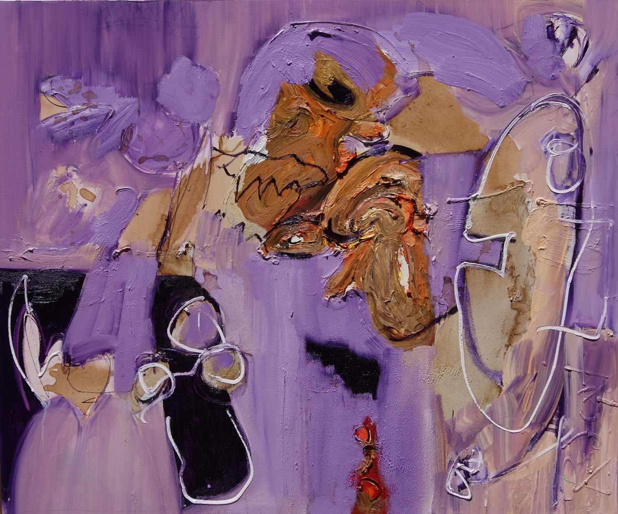 Ben je d'r klaar voor? referentie nummer 718. verschillende kleuren paars/vilet, met strip achtige afbeelding van een hoofd erin (rechts in het schilderij), een tekening met cartoon achtige schets diende als uitgangspunt c.q. inspiratiebron voor dit schilderij.