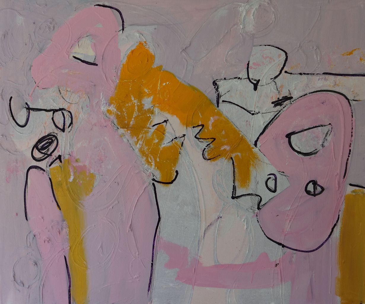 schilderij uit de serie "Ik was een lustobject", Het schilderij is in verschillende lagen opgebouwd, de structuur van de verf is een belangrijk onderdeel waardoor het levendige effect en diepgang bereikt wordt en het schilderij blijft boeien.