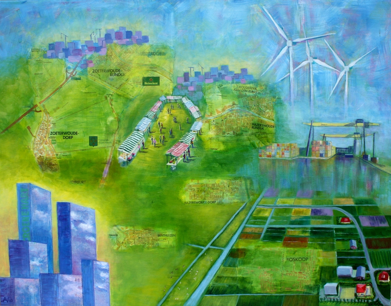Impressie van het groene hart, met oprukkende bebouwing. Gemaakt voor de Groene hart kunstprijs met als thema : Groene hart, Kloppend hart.