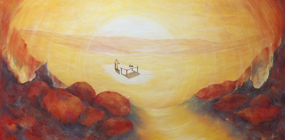 Schilderij Bijbels Uitnodiging Maaltijd Openbaring Tafel Jezus Rood Geel