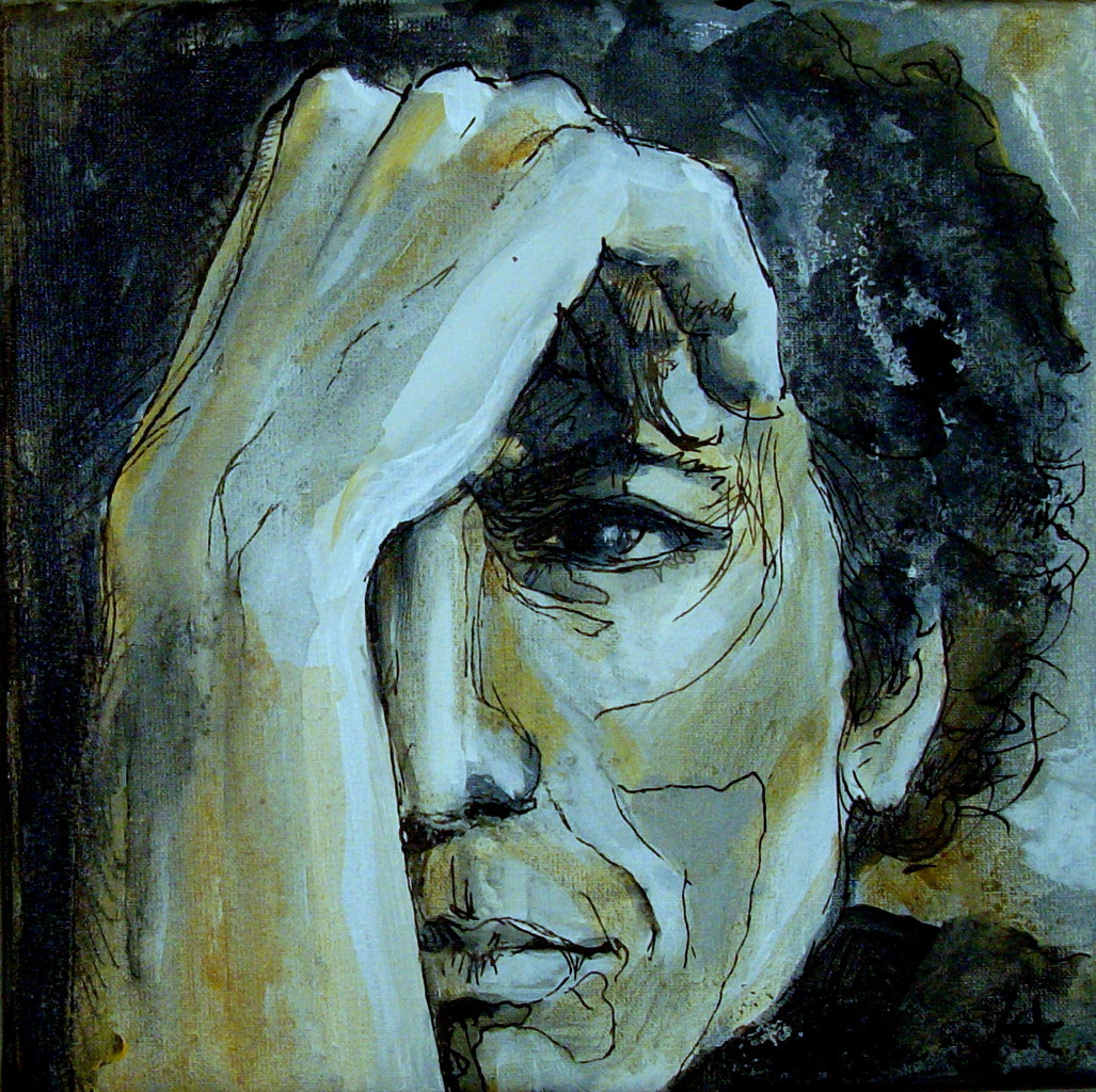 Portret van een peinzend persoon. Acryl met lijnen in o.i. inkt