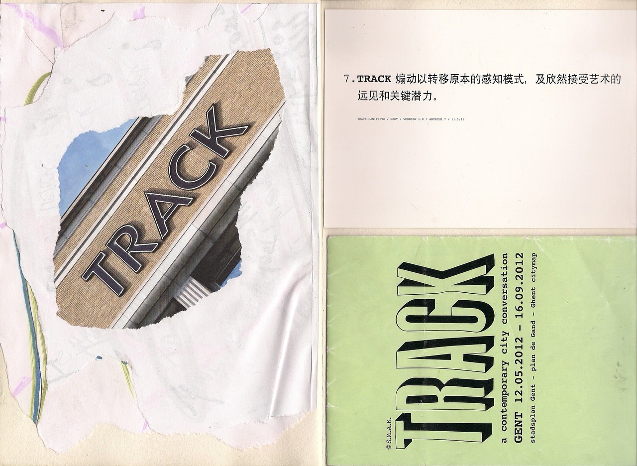 Een collage van; de zevende statement uit het manifest in het Chinees: 'TRACK zet ertoe aan om manieren van waarneming te herdenken en het visionaire en kritische potentieel van kunst te omarmen.', een foto van het SMAK als TRACK en de kaart van TRACK.