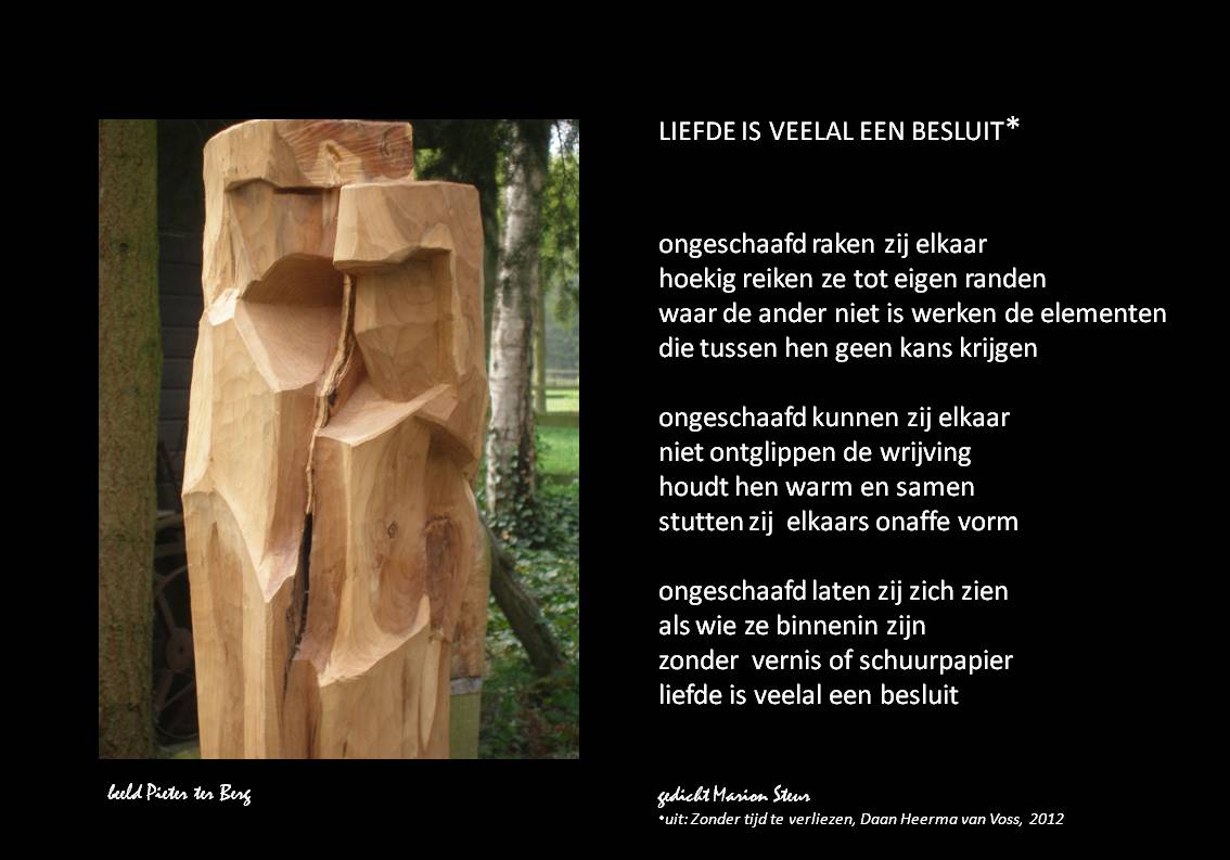Tijdens de Dijk van Kunst en Cultuur 2013 exposeerde houtkunstenaar Pieter ter Berg bij De Literaire Werkplaats te Eemnes. Bij dit beeld schreef schreef Marion Steur het gedicht 'Liefde is veelal een besluit', naar een citaat uit 'Geen tijd te verliezen' van Daan Heerma van Voss.