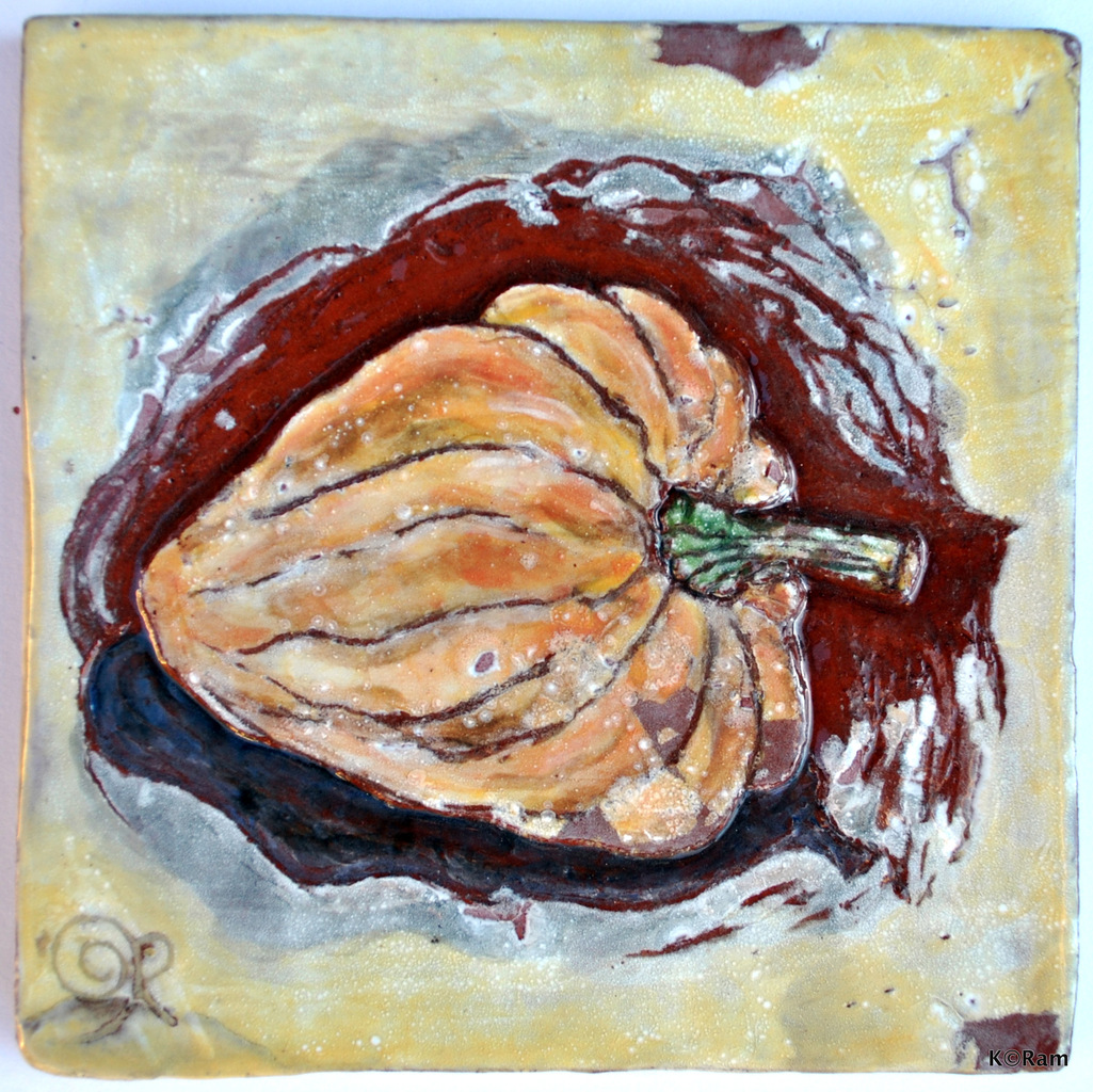 Oranje kalebas op roodbakkende klei in sgrafittotechniek met glazuur.