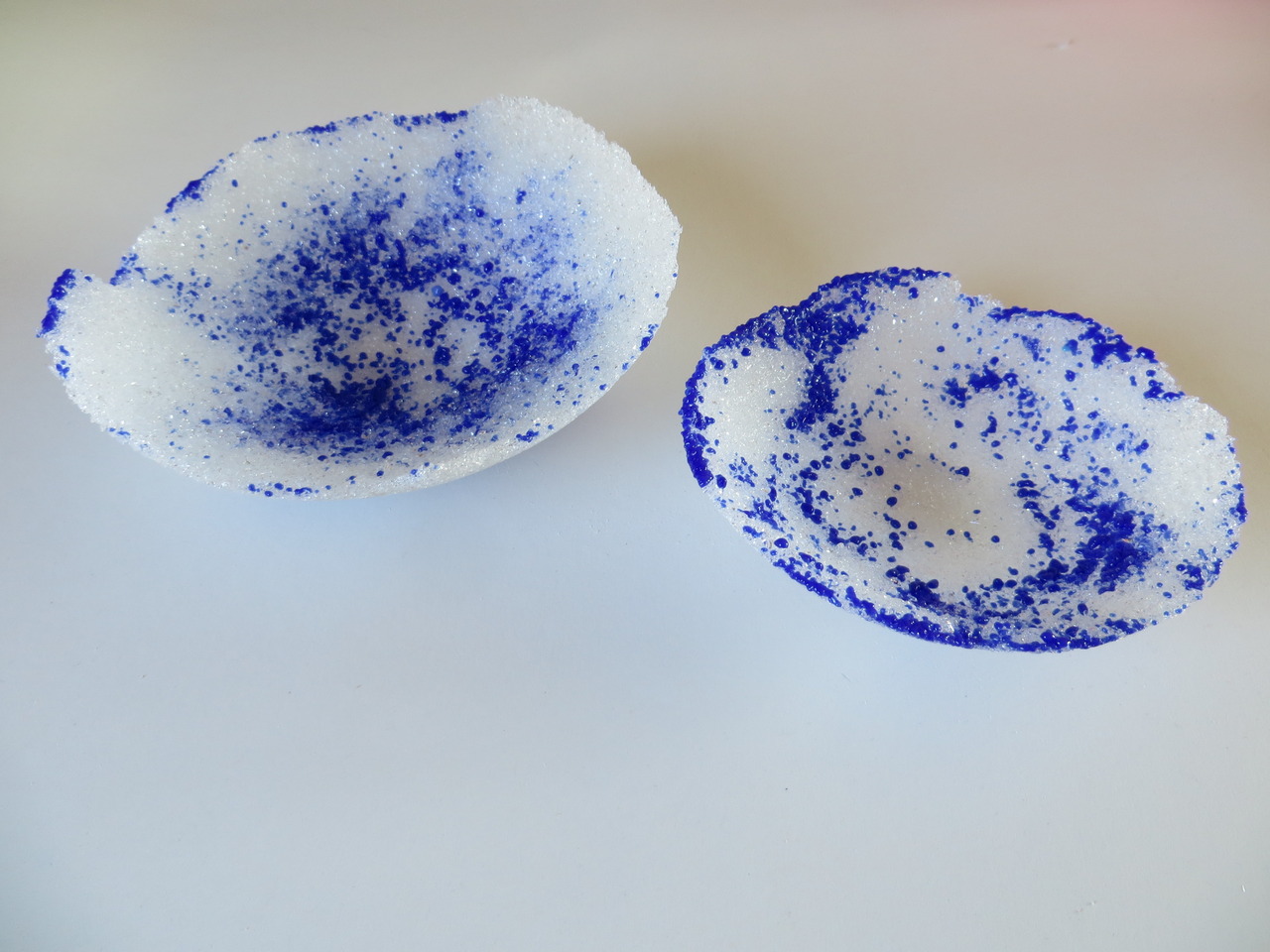 2 schaaltjes van verschillende afmetingen, die samen een set vormen. Er is gewerkt in de Pate de Verre techniek in blauw en wit glas. Een schaaltje is 15 cm doorsnee en 4 cm hoog. Het kleinere schaaltje is 11 cm doorsnee en 2-3 cm hoog. Prijs is voor het setje.