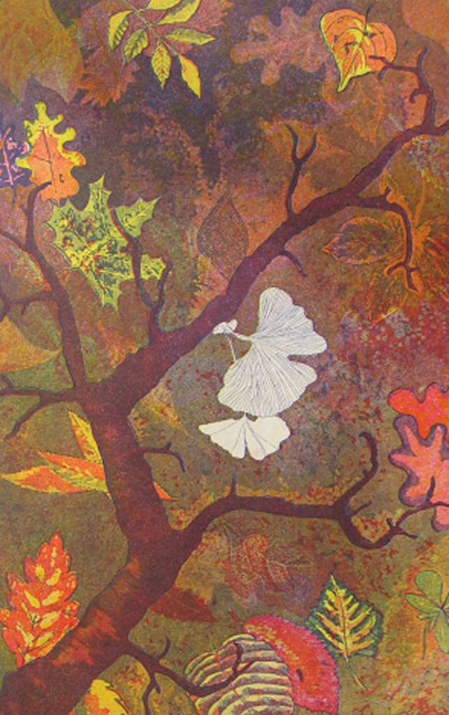 Een fantastisch blad, dat blad van de gingko.... Op deze ets heb ik het willen laten uitkomen in een warme kleurrijke herfstplaat (3 etsplaten over elkaar). Met de titel breng je er dan meteen een dubbele laag in aan: Wit is hier het buitenbeentje tegenover de veelkleurige "bevolking" van het bos.... Oplage: 50
