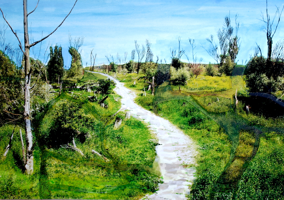 Een pad in de mooie Oostvaardersplassen. Collagepainting op aquarelboard.