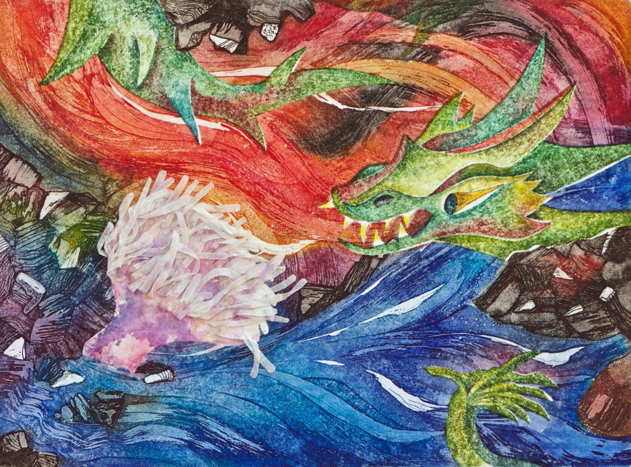 De basis van deze collage (een unicum) is de ets "Van grond en vuur". Deze werd gekanteld en het water (met de anemoon als bewoner) werd tegenover het vuur van de draak geplaatst. De draak is geschilderd in aquarel op vlieseline en deels over de ets gedrukt. Tegenstellingen genoeg: water en vuur, zachte ronde vormen, tegenover harde hoekige, zachte kleuren tegenover felle... Oplage: unicum