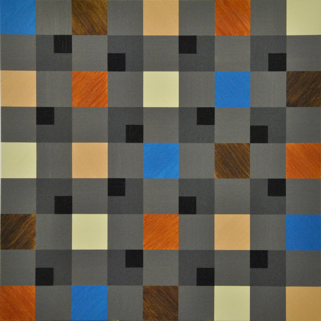 Thema: Chaos (Geometrische Chaos) Mijn kunst is beïnvloedt door de moderne wiskundige en wetenschappelijke benadering van het begrip complexe orde van de natuur. Met name heb ik me verdiept in de Chaos theorie en de fractal geometrie. Ik ben geen wiskundige, en ik gebruik geen wiskundige formules. De ideeën van de Chaos theorie en fractal geometrie leiden tot de ontwikkeling van de composities in mijn werk. Ik gebruik driehoeken,vierkanten en cirkels in mijn schilderijen, maar in mijn huidige serie, geoChao richt ik me alleen op de vierkanten en de verhoudingen tussen de vierkanten. Ik ontwikkel mijn composities door kleine vierkantjes op grote te zetten of grote op kleine te zetten. Het gaat om de onderlinge verhoudingen tussen de vierkanten. Ik laat de methode die ik kies de compositi