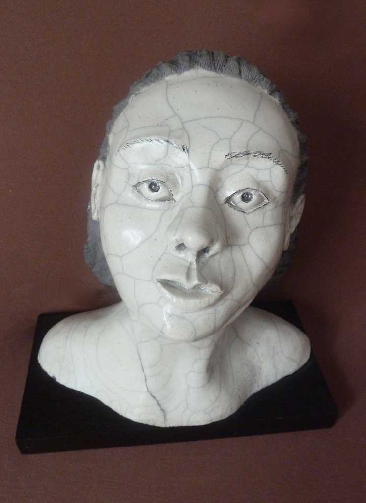 Zwart/wit raku gestookt vrouwenhoofd op zwarte houten sokkel, titel betekend tovenaars leerling in Afrika.