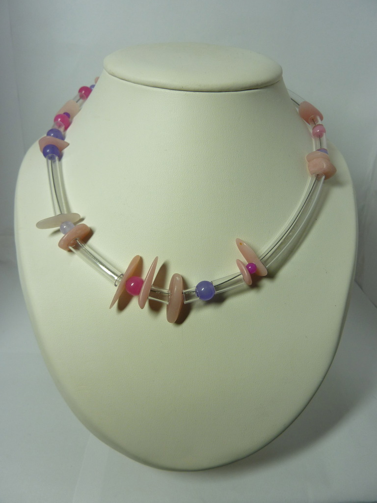 Ketting met kralen van ametist, rose opaal, verrassend gecombineerd met plastic buisjes (0.6 - 1.5 cm) incl. organza cadeau zakje en verzendkosten (47 cm)