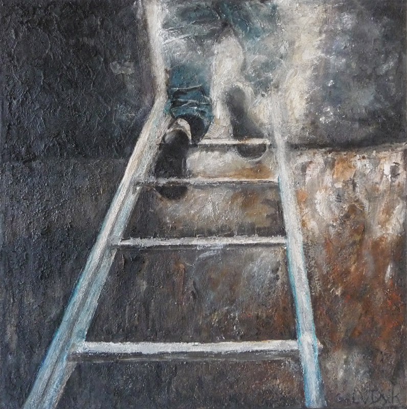 Iets in de buitenwereld intrigeert mij en door deze impressie uit te werken wordt zij blijvend deel van mijn binnenwereld. Laag na laag bouw ik aan de uiteindelijke vorm. Tijdens het werken komt er een stroom van associaties op gang. Het is een constant zoeken naar evenwicht tussen de verf en de andere materialen.