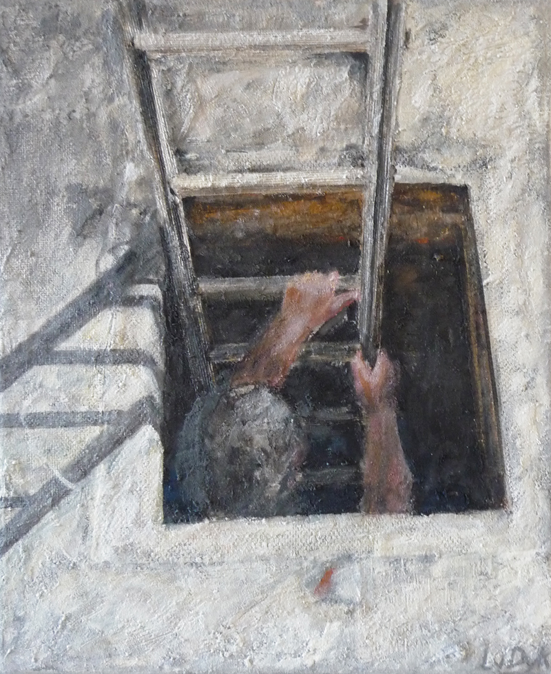 Iets in de buitenwereld intrigeert mij en door deze impressie uit te werken wordt zij blijvend deel van mijn binnenwereld. Laag na laag bouw ik aan de uiteindelijke vorm. Tijdens het werken komt er een stroom van associaties op gang. Het is een constant zoeken naar evenwicht tussen de verf en de andere materialen.