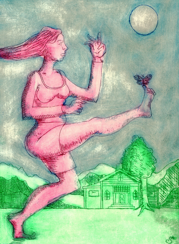 Ik maak figuratief-sureeele etsen, tekeningen, digitale grafiek, schilderijen en 3D objecten, vaak met wat ironie.