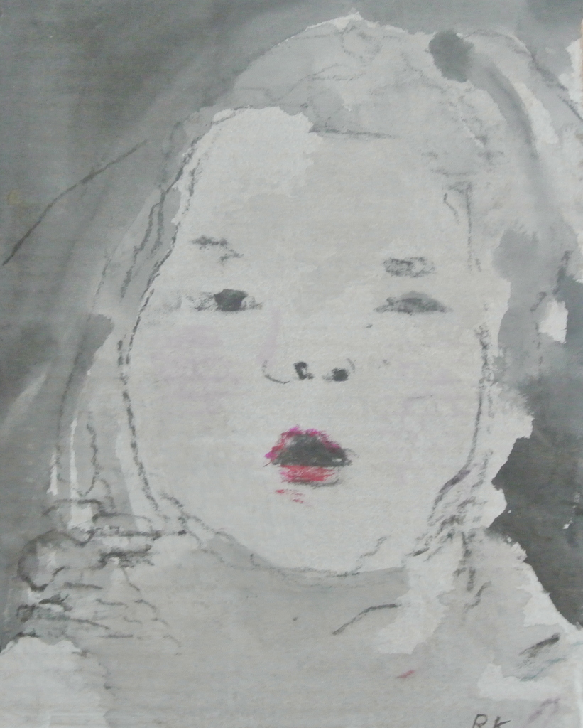 Jong meisje met rode lippen. Oostindische inkt, acryl op karton.