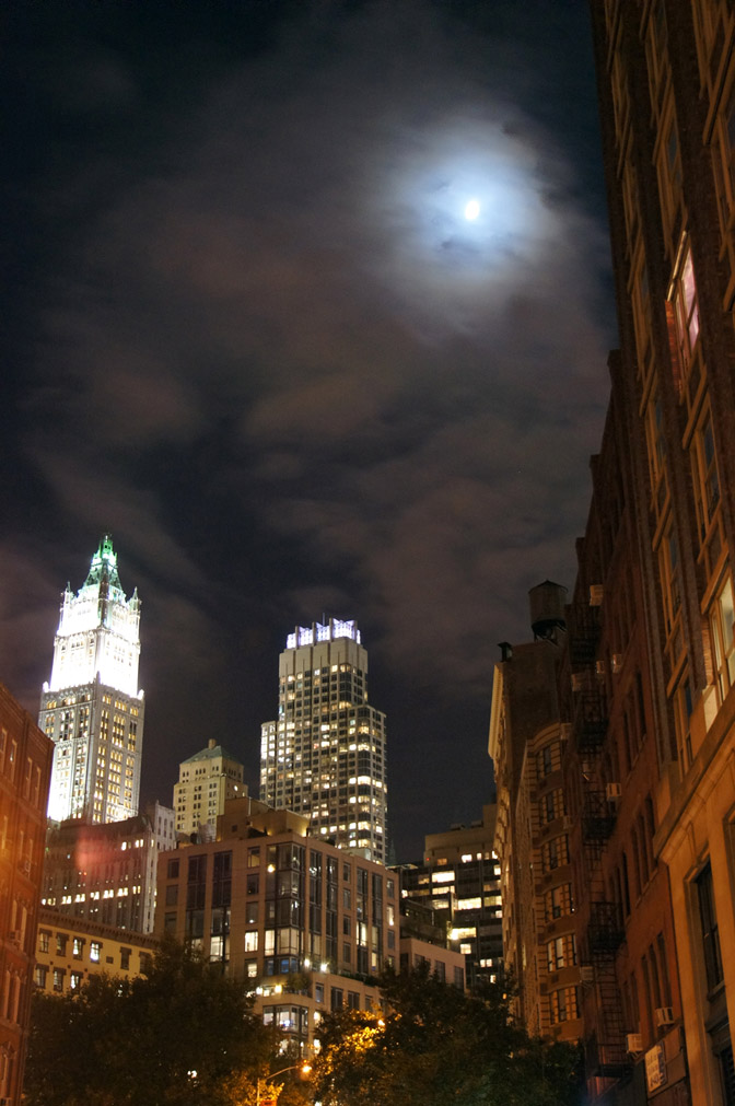 Geel Blauw Wolken Maan Donker Stad Gebouwen Avond City Manhattan Kantoren Lights Lichtjes Appartementen