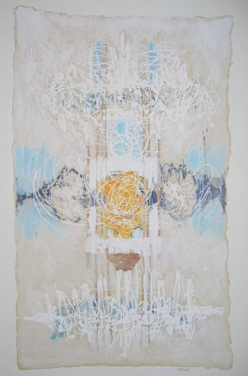 Een feest van wit.Het werk is gemaakt op een vel handgeschept papier, dat vervolgens is opgelijmd op een linnen doek.