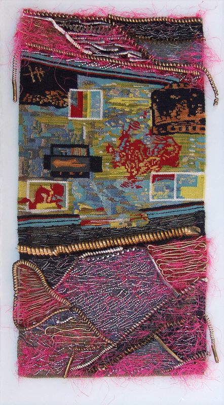 Een collage in de vorm van een wandtapijt samengesteld uit verschillende textiel en armbanden en halskettinkjes.