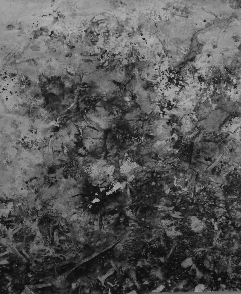 Tekening, gemengde technieken. Inkt, houtskool,potlood,acrylverf en aarde op papier. Groot formaat. Ingelijst met passe-partout.