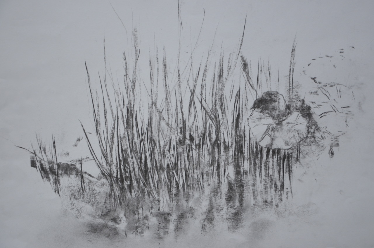 Houtskootekening, ingelijst. Ontstaan na buiten tekenen. Kralingse bos, Rotterdam.