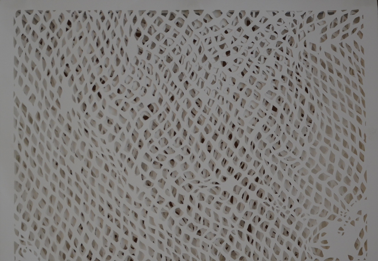 3D werk, 4 lagen papier. Patronen uitgesneden. In opdracht van het Meermanno museum, Thema 'Het andere boek' met houten witte omlijsting (kast)