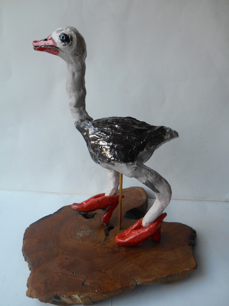 Jonge struisvogel in grote rode wiebelende hoge hak schoenen
