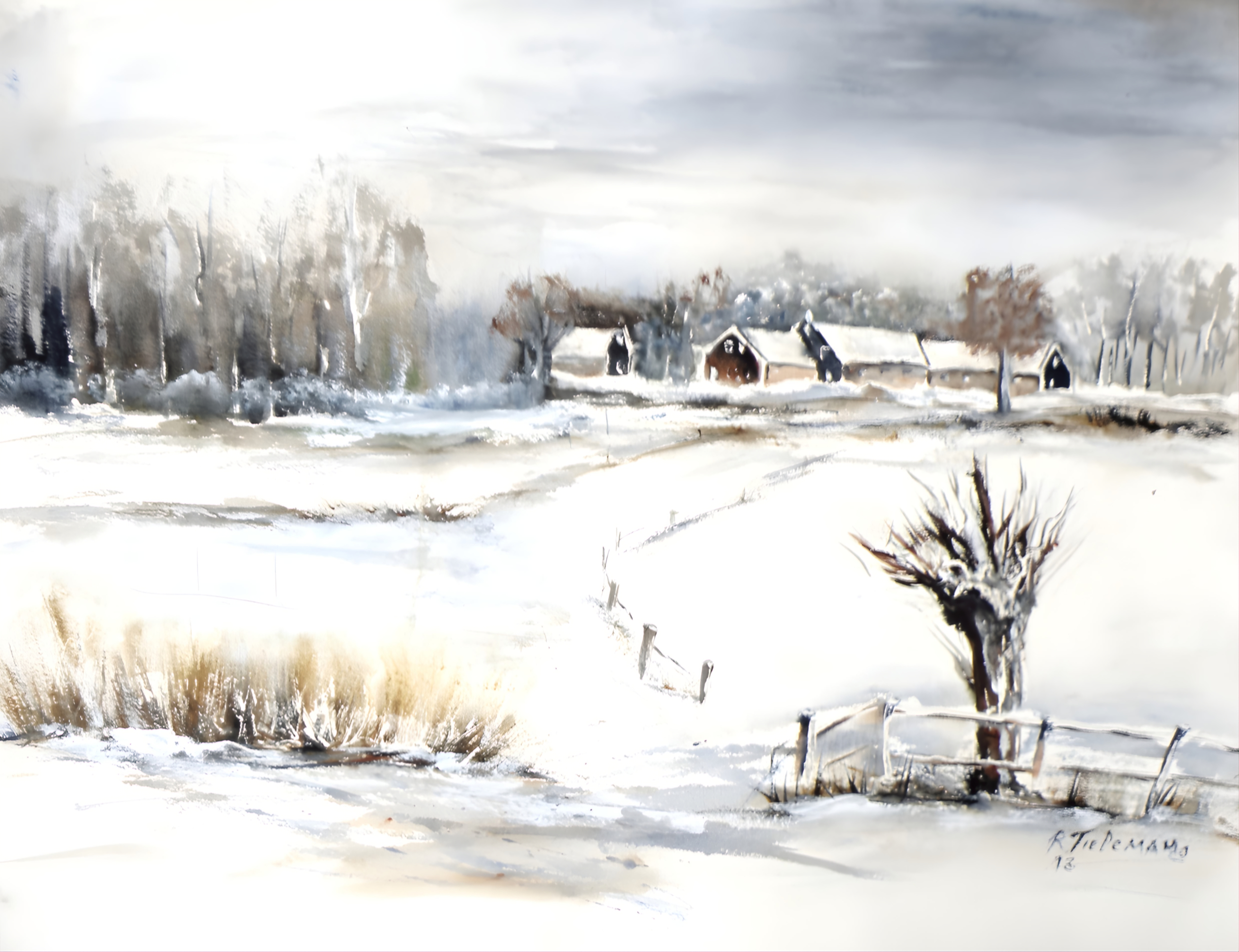 Dit werk toont een stil winters landschap onder een zachte, bewolkte lucht. In de verte zijn enkele huizen zichtbaar, omringd door kale bomen, terwijl de voorgrond open en licht blijft. Het kleurgebruik is ingetogen, met transparante lagen in koele blauwen en warme aardtinten. De compositie straalt rust en ruimtelijkheid uit, met een evenwichtige afstemming tussen landschap en licht.