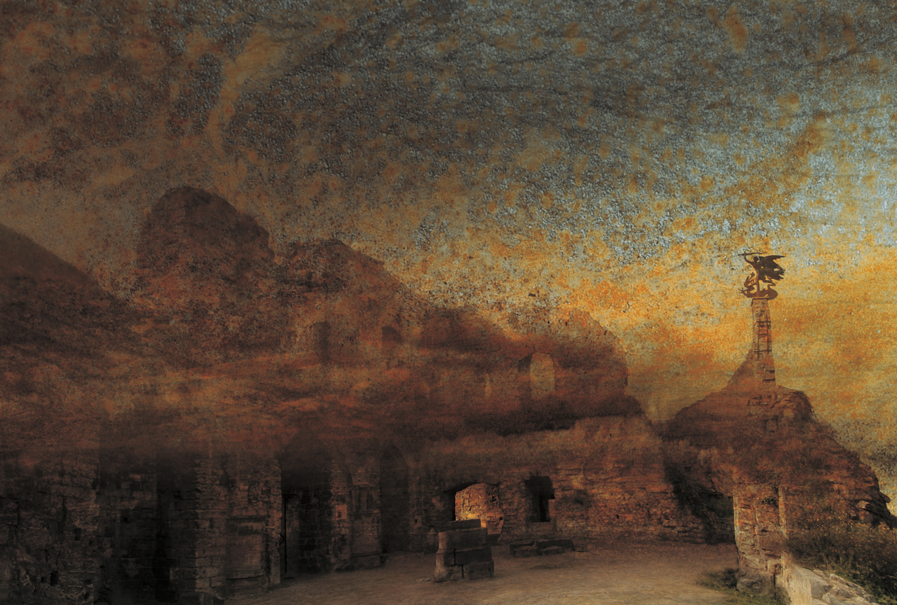Foto uit een serie van drie foto's. Kasteelruine in een desolate omgeving.