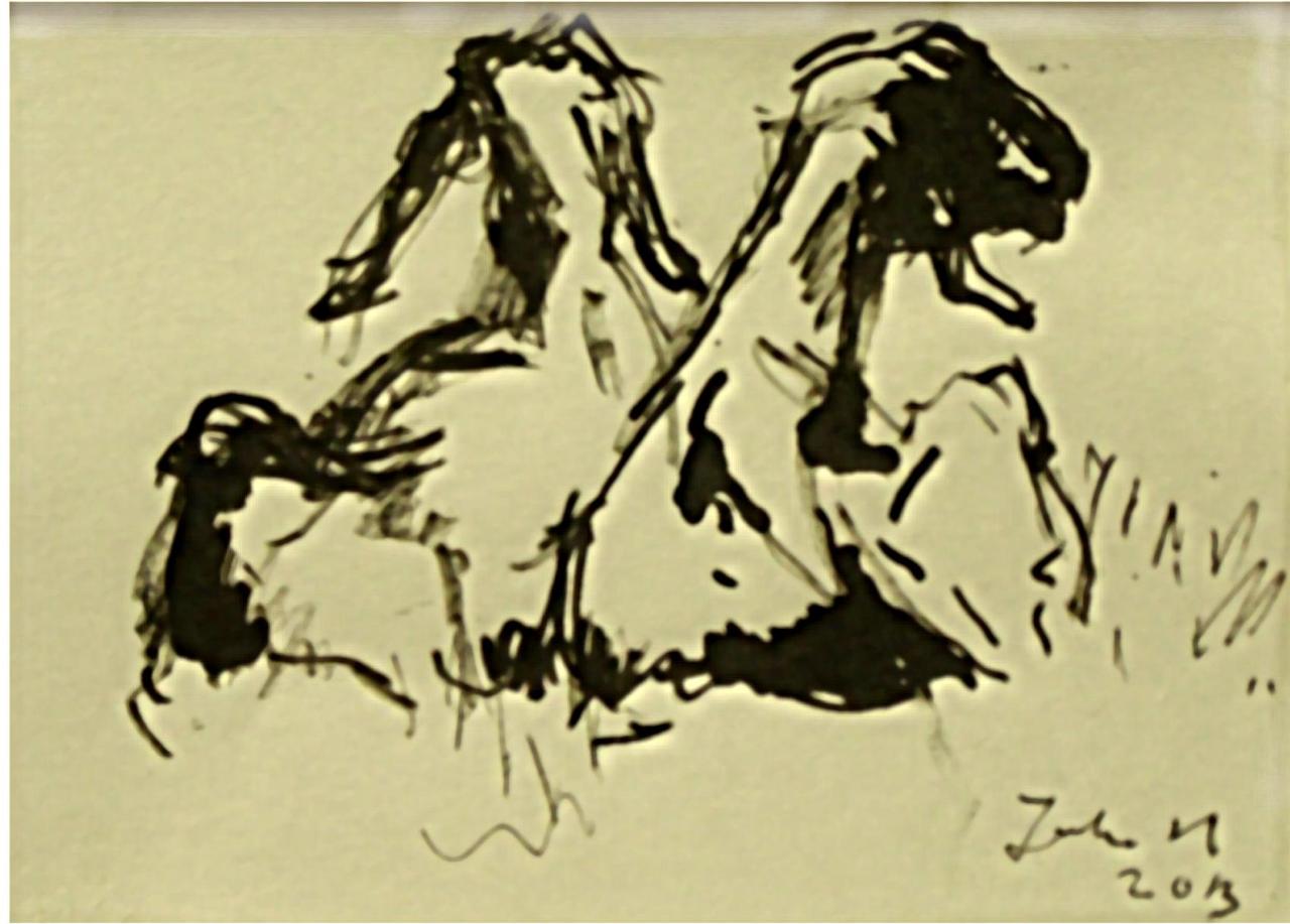 Tekening in inkt gemaakt in kinderboerderij. De tekening is 14x 20cm. en wordt geleverd in passe-partout van 24x30 cm.