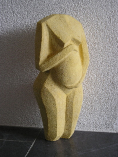 beeld van zwangere vrouw uit kalkzandsteen gehakt