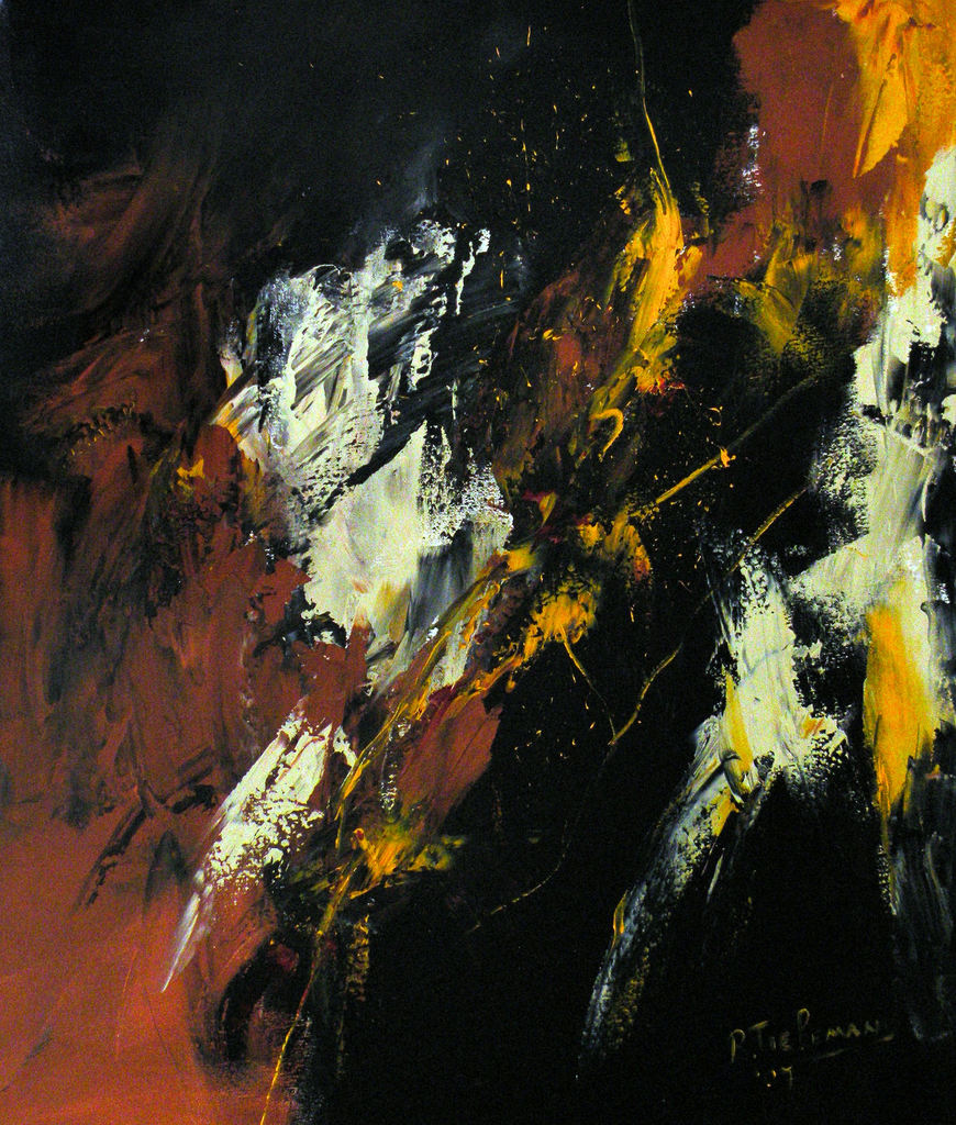 Abstract kunstwerk dat opvalt door zijn dynamische en expressieve penseelstreken. De dominante kleuren zijn zwart en diep rood, die samen een dramatische achtergrond vormen. Vanuit deze donkere basis exploderen levendige geel- en witaccenten, wat het geheel een gevoel van beweging en energie geeft. De compositie heeft een krachtige balans tussen chaos en structuur, typisch voor abstract expressionisme. De combinatie van kleuren en texturen geeft het werk een intense emotionele lading en maakt het open voor interpretatie.