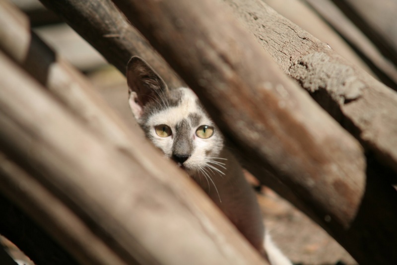 Een verlegen meisje bestudeert de fotograaf vanuit haar beschutte wereld