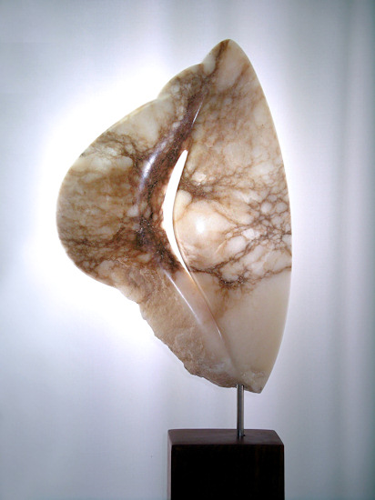 Albast op hoge houten sokkel. Albast kan niet buiten! Belangrijke eigenschap van albast is transparantie. Als het (kunst)licht erdoor heen schijnt krijgt het een mooie warme gloed.