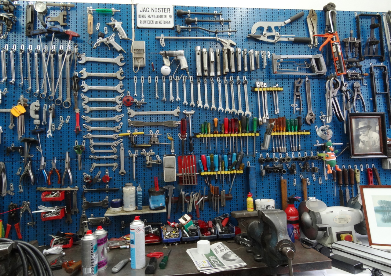 De keuze / om deze assemblage van werktuigen / in mathematische volgorde / of in wanorde / te vertonen / lag bij de artiest. Artiest: Jack Koster (NL), houdt een rijwielherstel galerie draaiende. Gefotografeerd door Drager Meurtant.