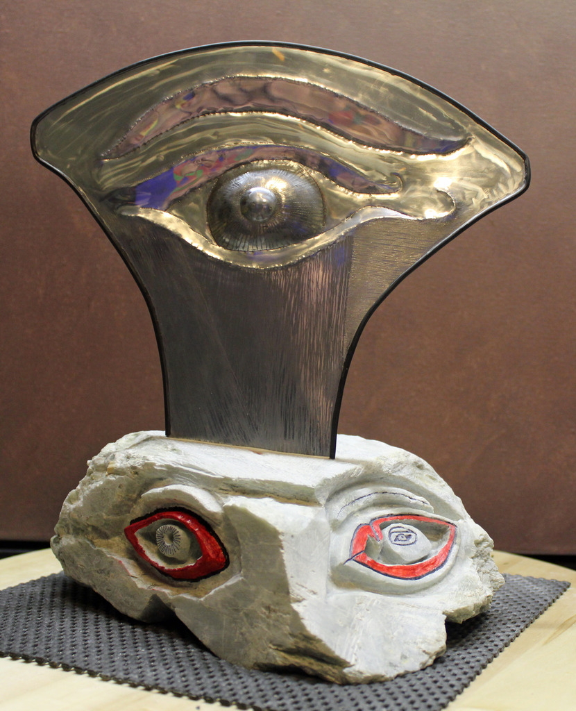 Who are you. Aluminium plaat bewerkt zodat er een oog zichtbaar is geworden. Staand op een sokkel van speksteen met twee ogen.