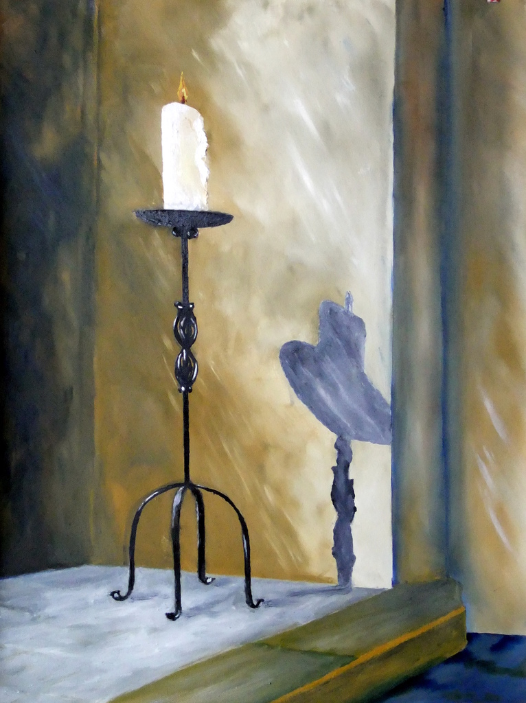 Een moment van zonlicht laat een schaduw van deze kandelaar schijnen