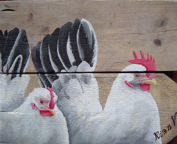 Kippen geschilderd op verweerde steigerdelen. Afgelakt zodat het schilderij ook buiten kan hangen.