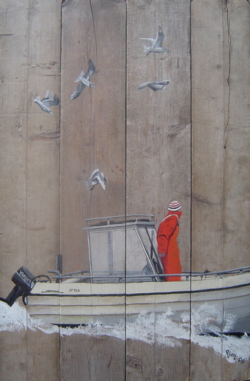 Noordzeevisser, geschilderd en afgelakt zodat het schilderij ook buiten kan hangen.
