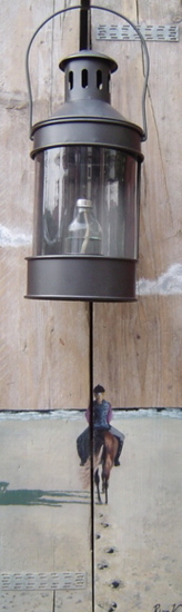 Paardrijdster met lamp. Geschilderd op verweerde steigerdelen, afgelakt zodat schilderij ook buiten kan hangen.