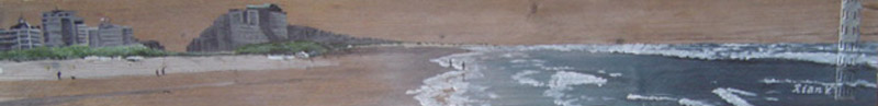 Sky-line Noordwijk geschilderd op verweerde steigerdelen. Afgelakt zodat het schilderij ook buiten kan hangen.