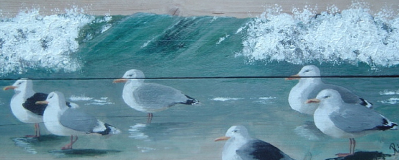 Meeuwen in de branding geschilderd op verweerde steigerdelen. Afgelakt zodat het schilderij ook buiten kan hangen.