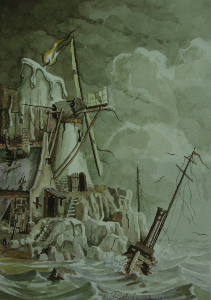 Boot Zee Landschap Anker Rotsen Molen Kaars Storm Gevaar Realisme Fantasie Romantiek Papier Aquarel