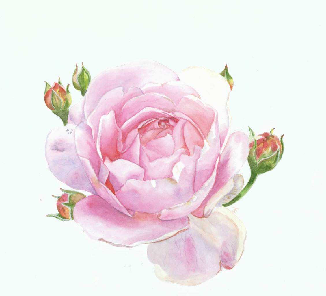 Aquarel van een klein rose roosje met kleine ongeopende knopjes.