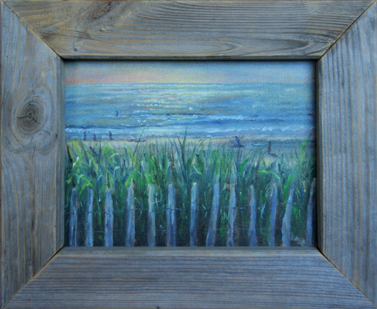 Een zomerse avond gezien vanaf een strandopgang in Noordwijk met surfers op de achtergrond, nagenietend van een zonnige dag. Verkocht.