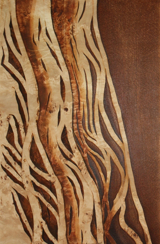 Een collage van fineer van de Mappawortel en Kersen Inkt op mappawortel en kersen op paneel