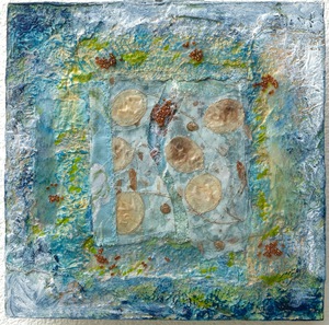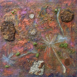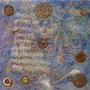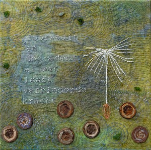 Ik ben een materialen mens, en maak samenvoegingen van verschillende materialen; foto’s, stoffen en borduursels, soms ook gecombineerd met hout, lood en steen, op wisselende formaten