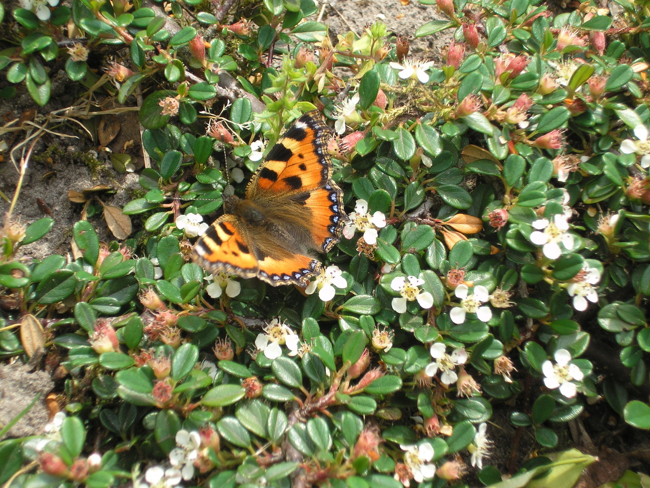 Deze vlinder heet kleine vos en vloog tussen de bloemen van de cotoneaster Streib's Findling.