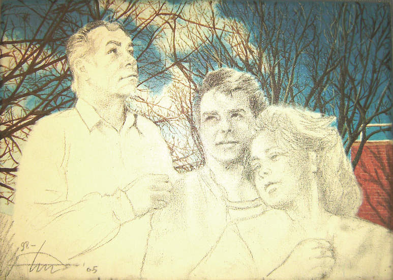 Een driedubbelportret , ikzelf in het midden, links mijn broer Robert, en rechts mijn zus Carin. Nooit afgemaakt want dat hoefde niet persé vond ik. Zo ook mooi. Het contrast tussen schets en uitgewerkte achtergrond is op zich al interessant.